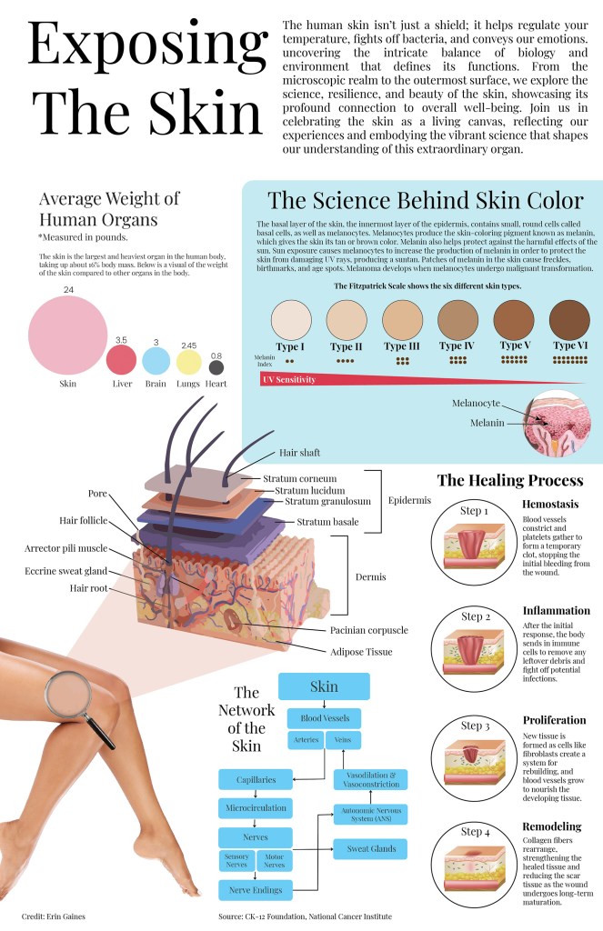 For this assignment, I was tasked with doing in-depth research to create an infographic on a scientific topic of my choice. I chose to explore the human skin, focusing on its structure, functions, and the biology behind skin color and healing. This project gave me the opportunity to design and integrate a variety of visual formats into a cohesive narrative. Throughout the process, I strengthened my skills in visual hierarchy and scientific visualization while learning to balance educational content with engaging design.