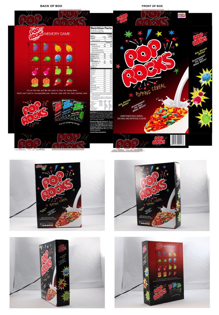 For this project, I was tasked with designing a cereal box concept from scratch. I chose to turn the nostalgic candy Pop Rocks into a breakfast cereal. This project sharpened my skills in packaging layout and branding continuity. I created a full box design in Adobe Illustrator, including nutrition panels and an interactive game on the back. I also practiced product photography and physical mockup construction to present the final design in a realistic context.